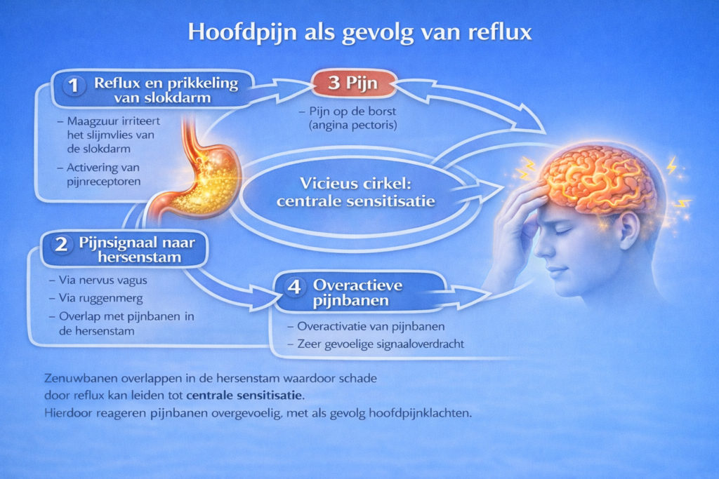 • Chronische fase: Je hersenen hebben geleerd om hoofdpijn te koppelen aan de maagzuurprikkels, zelfs als deze minder ernstig zijn.